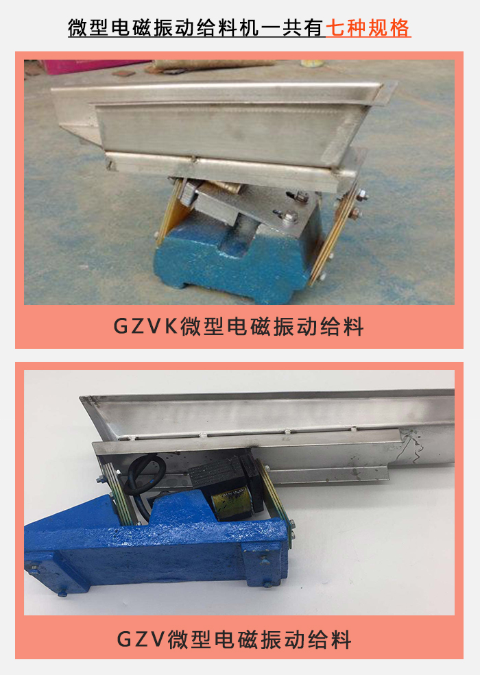 注:GZV微型電磁振動給料機一共有七種規格,包含GZVK微型電磁振動給料機兩種規格,它是在GZV型號的基礎上,根據用戶的要求而開發的新型產品。它不僅具有GZV的性能和特點,其結構和原理也都一樣,而且生產能力大給料均勻平穩。
